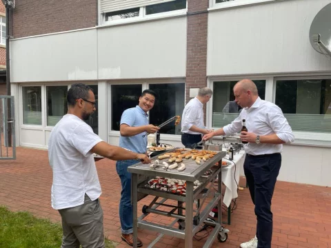 Pastor Thomas Burke came up with the idea: a barbecue evening with all of GERVIE’s Vietnamese trainees and skilled workers to get to know them personally and ask about their experiences so far. Also present were Mechthild Weßling from the Emsland Business Association as well as Ansgar Veer and Gerd Egbers from the Bonifatius Hospital.